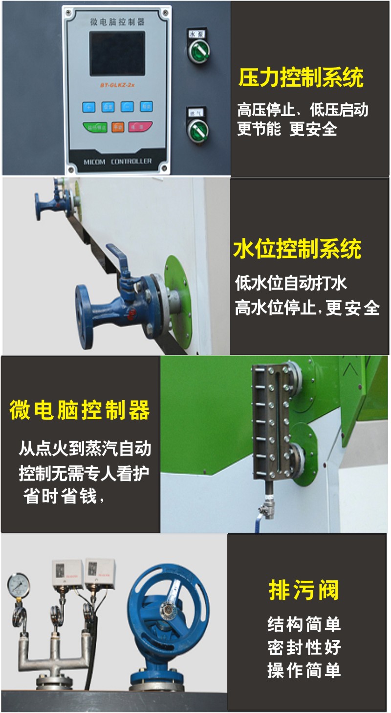 4、配置有壓力控制器、安全閥、并設有超壓、低水位的過熱等多重保護。